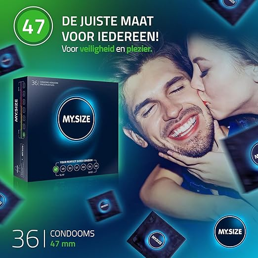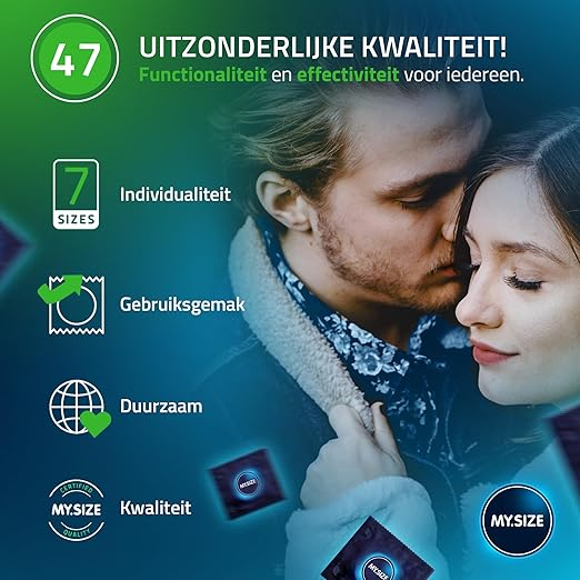 My.Size Pro 47 mm condooms zijn extra dunne condooms voor meer veiligheid door juiste pasvorm met tegelijkertijd een intens gevoel. De My.Size pro condooms zijn gemaakt van Vytex latex, 90% minder latexproteïnen dan gewone latex. Uitermate geschikt voor mensen met een latex allergie. De My.Size Pro condooms ruiken ook niet naar rubber omdat er gebruikt gemaakt is van zeer zuivere Vytex Later