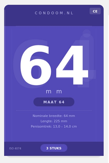 Een condoom met een nominale breedte van 64 mm past bij een penis met een omtrek van 13 tot 14 cm. De breedtemaat van 64 mm is de zogenaamde nominale breedte: de breedte van het condoom wanneer het plat ligt. Condooms 64 mm zijn gemiddeld 225 mm lang — aanzienlijk langer dan reguliere condooms die gemiddeld 180 mm meten — en bieden daardoor een volledige dekking voor mannen met een dikkere penis.